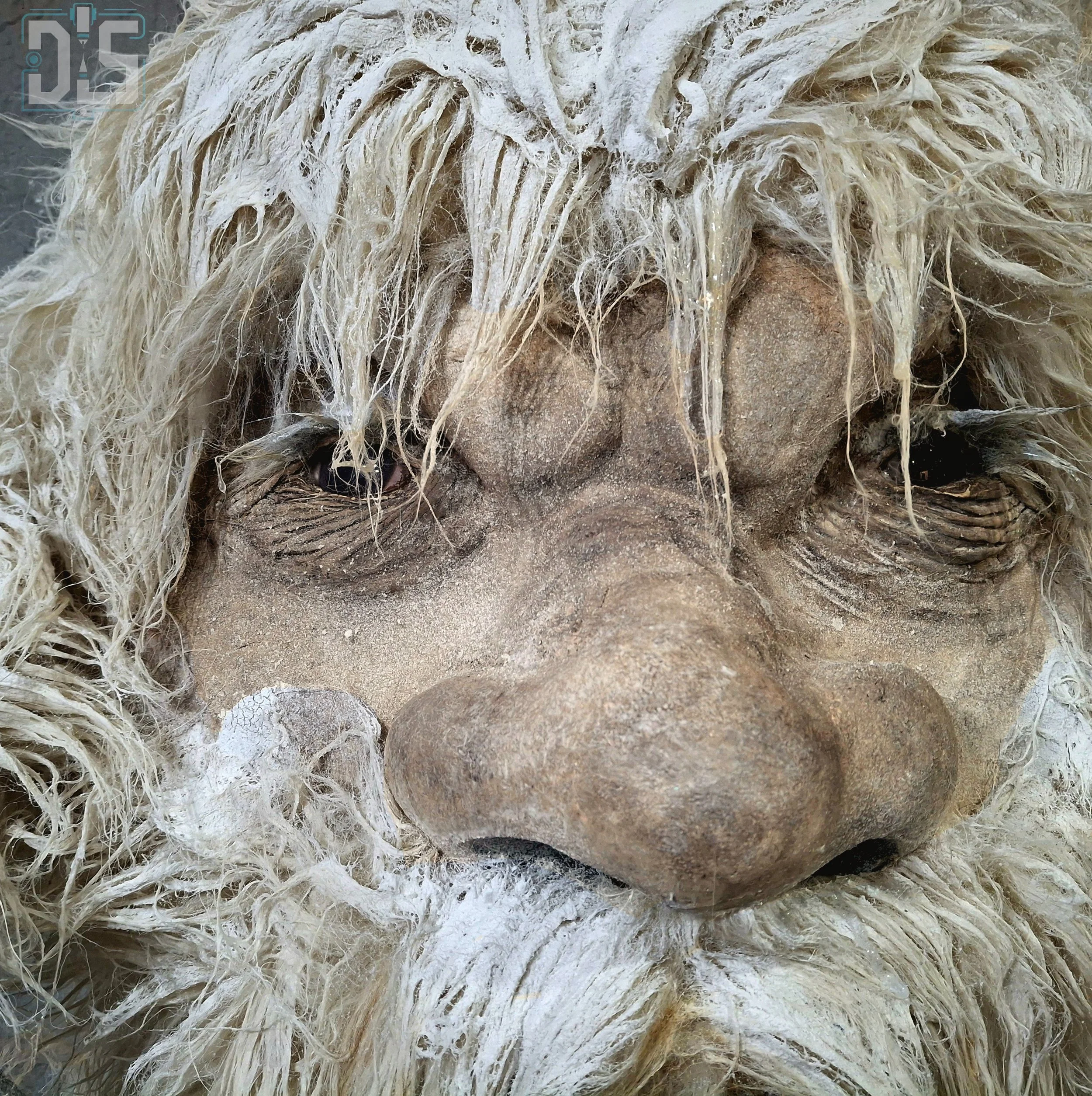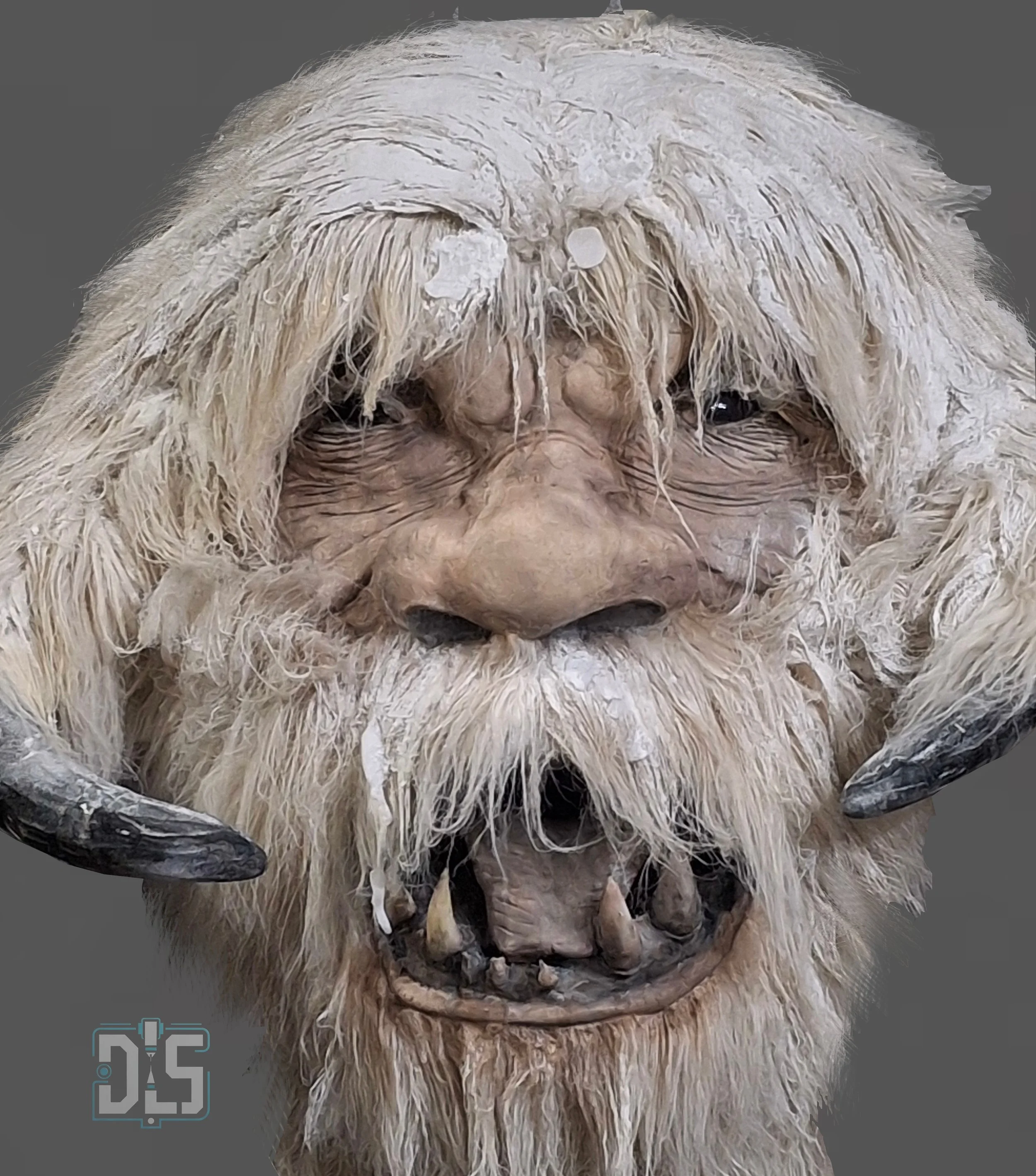 Hairwork: Dense, multi-layered synthetic fur hand-distressed to simulate moisture-laden, frozen fibers.